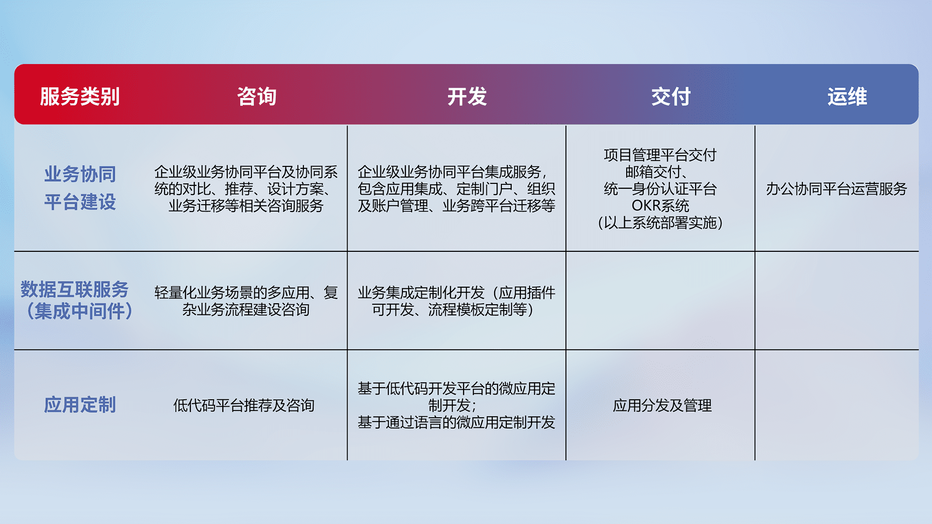 针对钉钉、、、、企微、、IDaas等平台级产品提供产品的规划、、方案、、交付、、、定制化开发等服务,,,,实现如统一协同办公、、、、智能客户服务、、、混合会议管理、、智能数据查询、、等业务场景,,,,实现数字化转型。。。